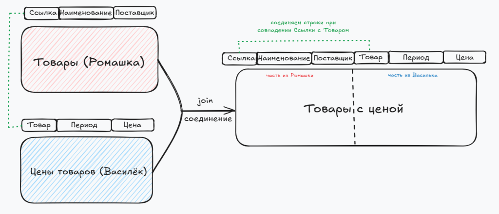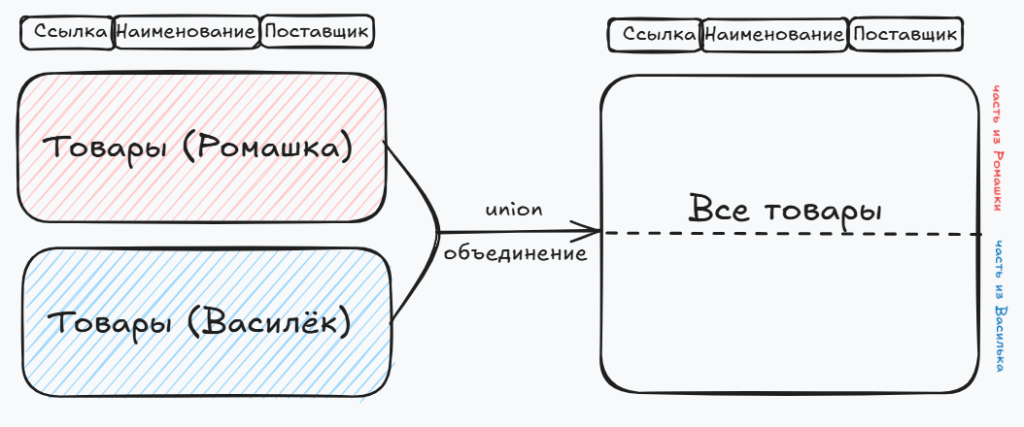 Соединение. «Склеиваем» колонки из двух источников данных, если выполнено какое-то условие (обычно равенство двух колонок, аналог оператора JOIN в SQL). Это подходит для совмещения данных из разных ИБ: