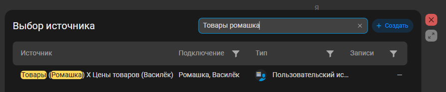 2. В редакторе источников совмещаем источники данных из разных ИБ в один общий источник.