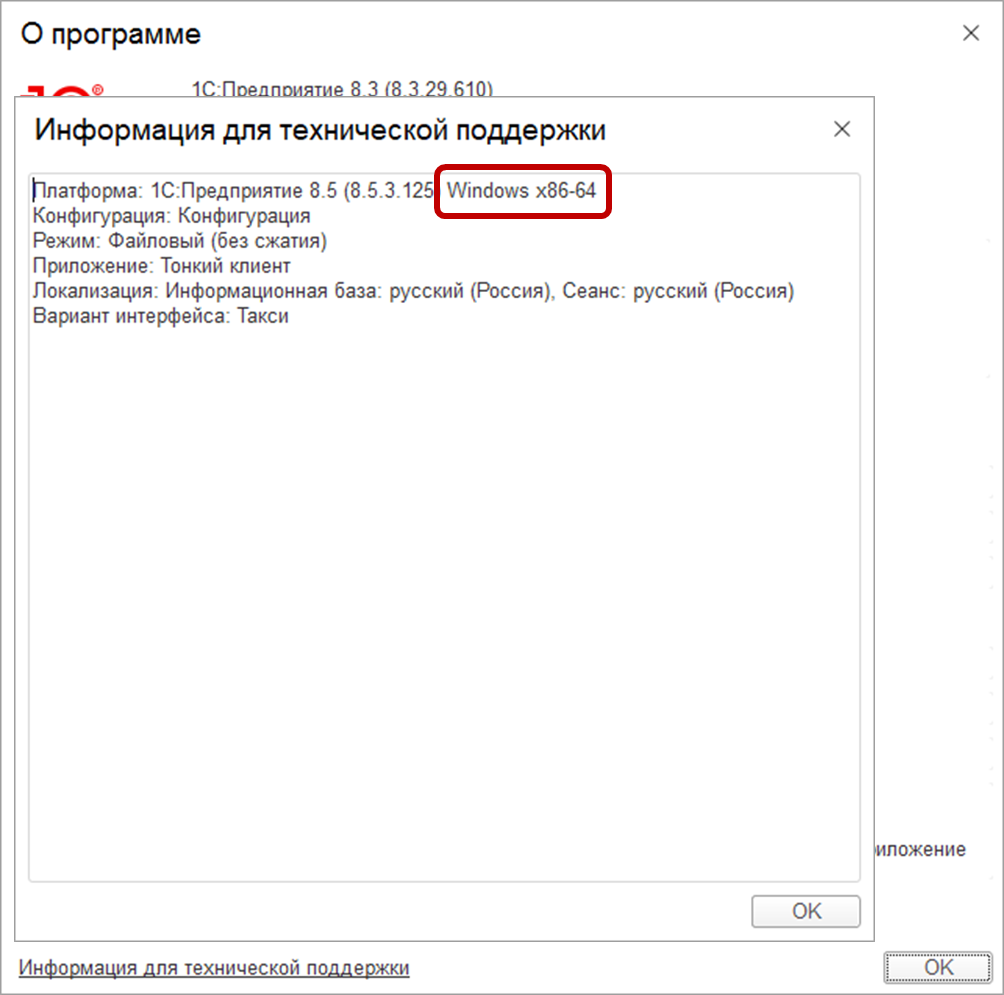 Начиная с версии 8.5.3 в окне "О программе" при нажатии на линк «Информация для технической поддержки» будет показываться информация о типе платформы клиента в формате, аналогичном строковому представлению значения типа ТипПлатформы для СистемнаяИнформация.ТипПлатформы.