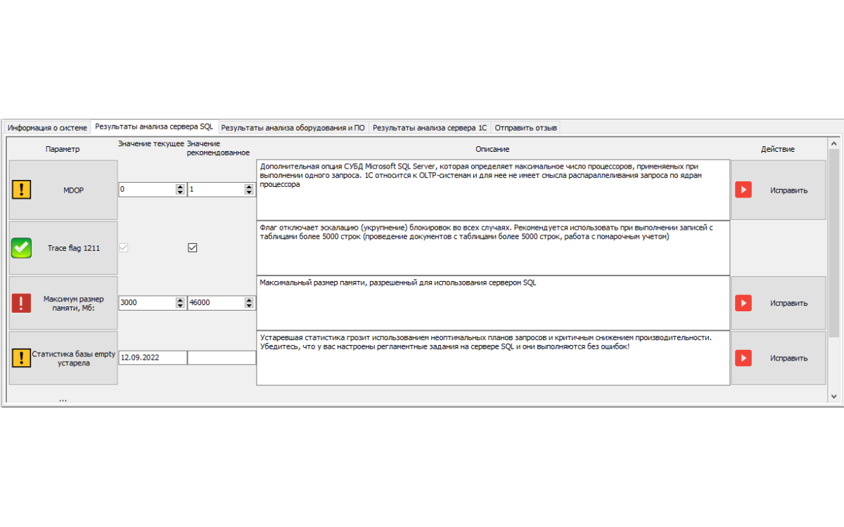 Программа для тестирования вашей инфраструктуры 1С. Анализ ключевых параметров оборудования и ПО серверов 1С и MS SQL, поиск ошибок в базах 1С на стороне MS SQL, тестирование производительности серверов MS SQL и 1С, обмен результатами замеров с сообществом, построение отчета.